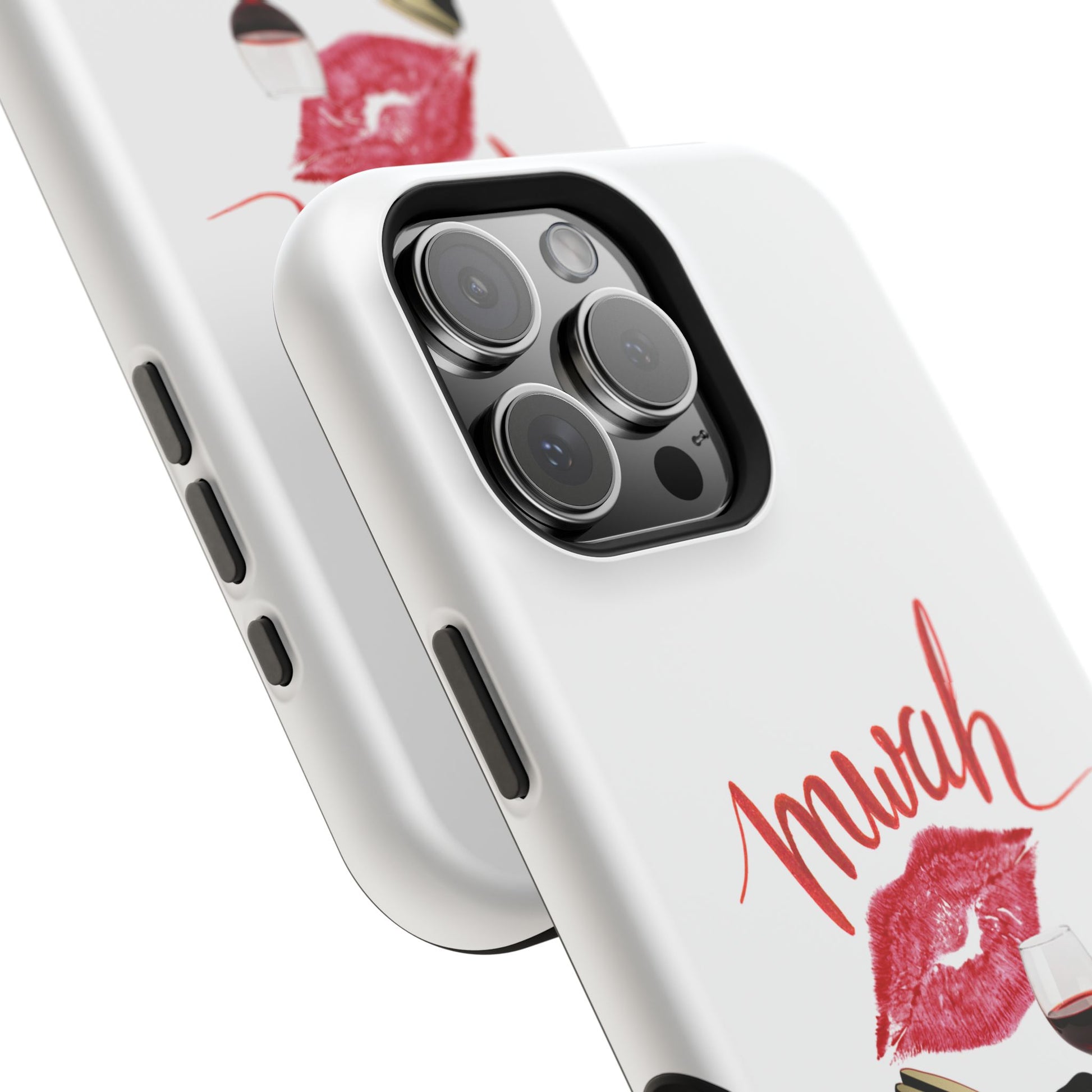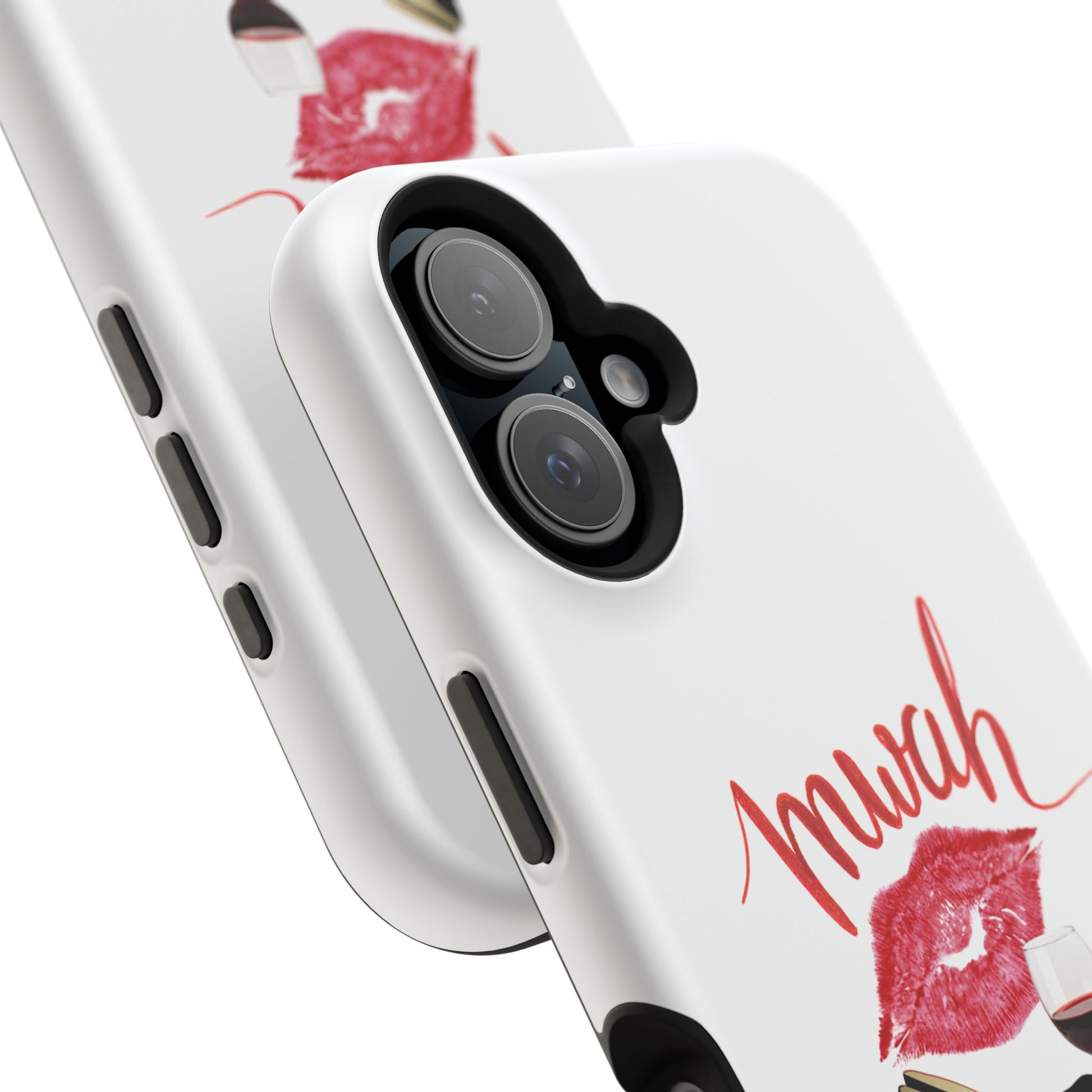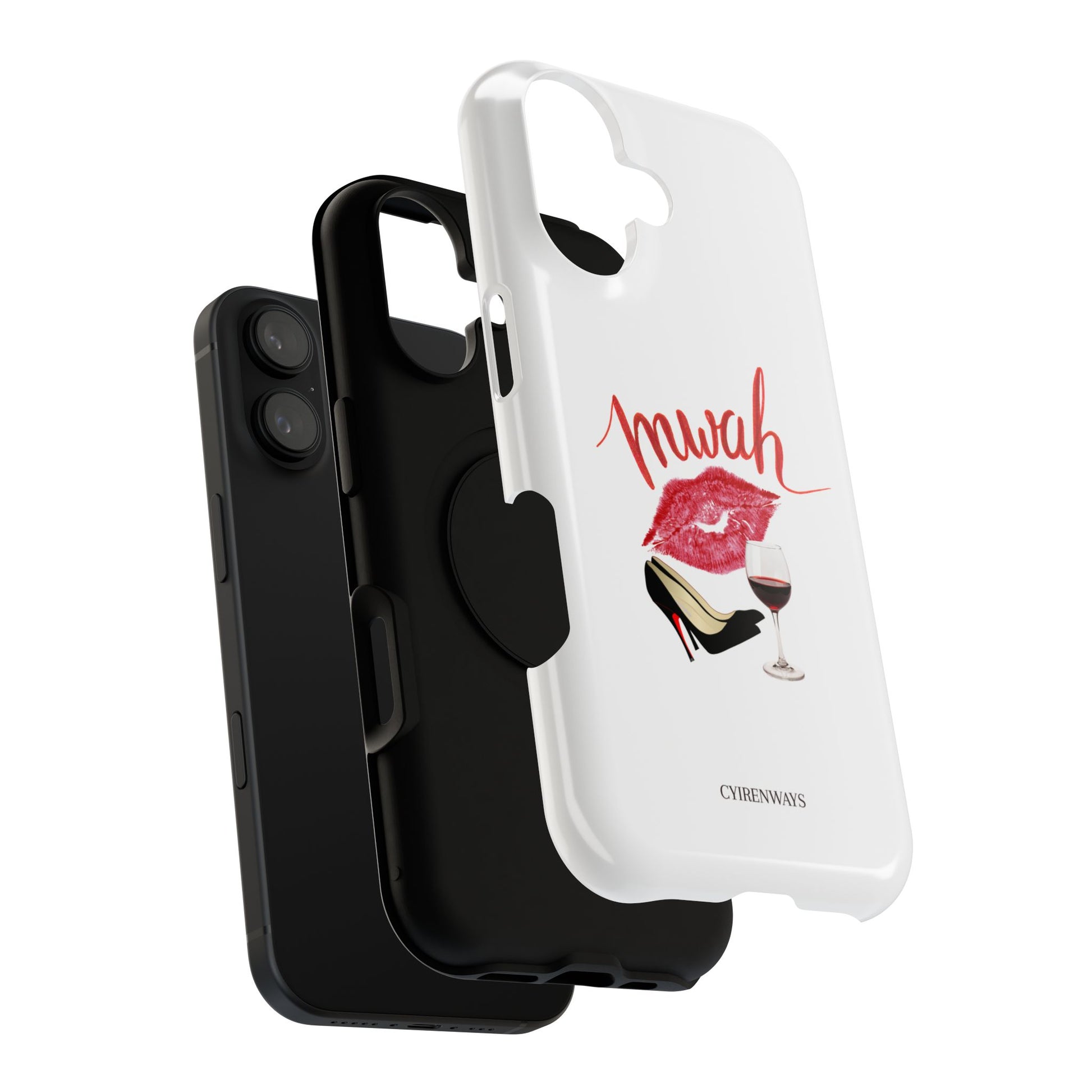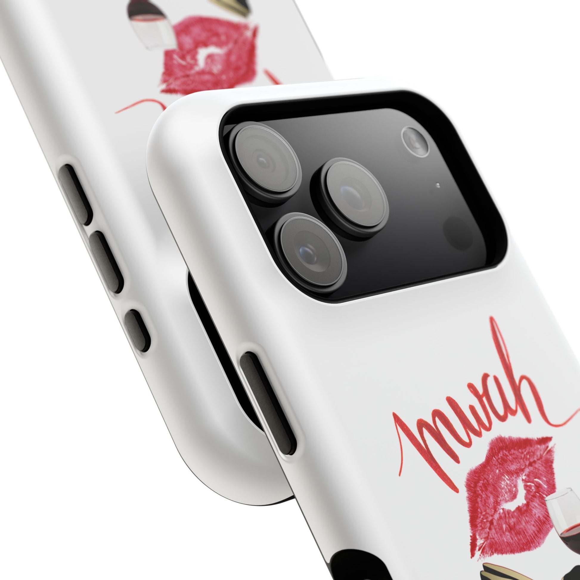 A bold, playful art for your everyday case protection. The soft white background showcases a lipstick kiss, a stiletto, and a glass of red wine beneath a hand-lettered "mwah" — a little wink of glamour for anyone who moves through life with style and a sense of fun. Choose from a glossy or matte finish, so it looks as polished as the person carrying it. It slips easily into a bag, supports wireless charging, and keeps your device safe from scratches and minor bumps while broadcasting a cheeky, confident vibe.I