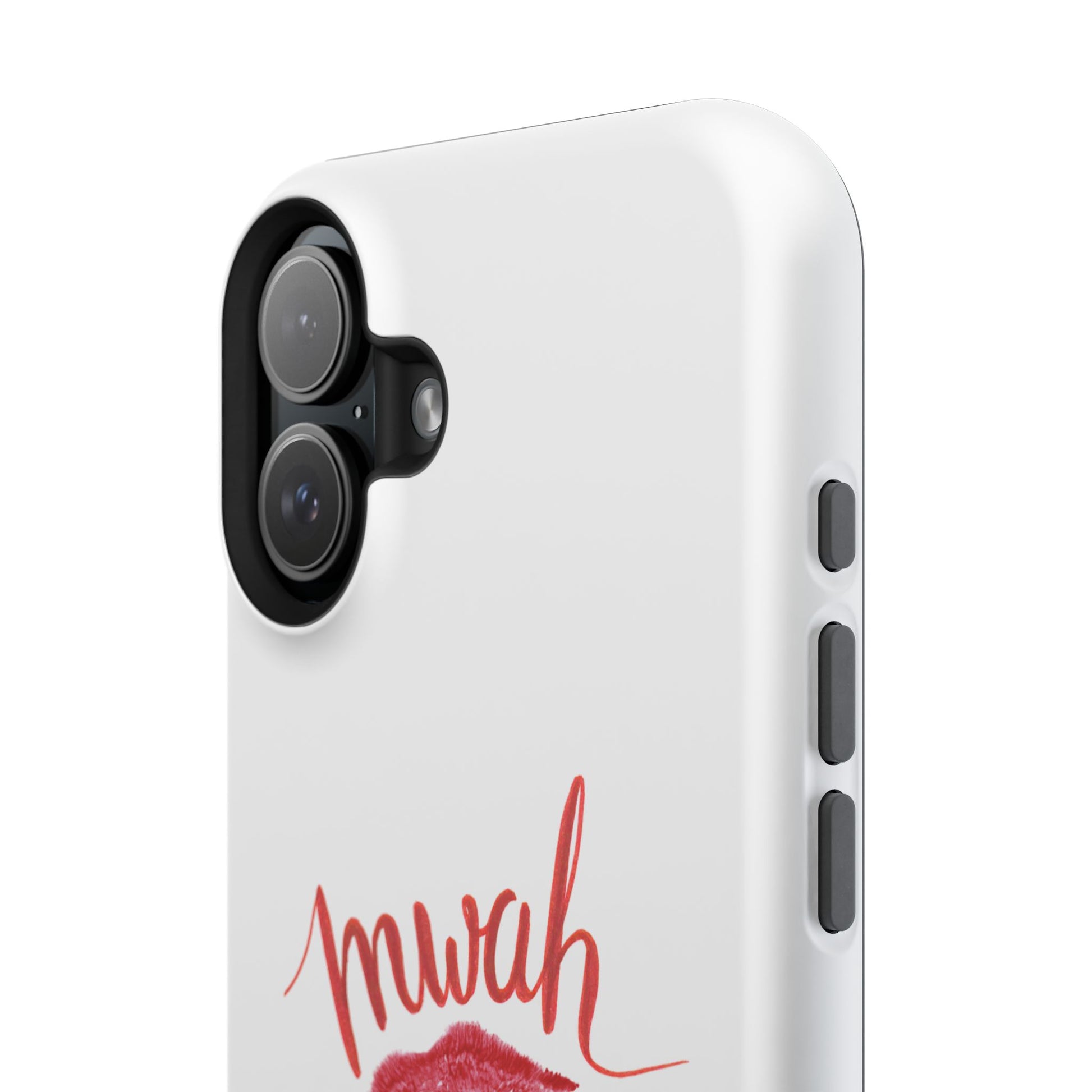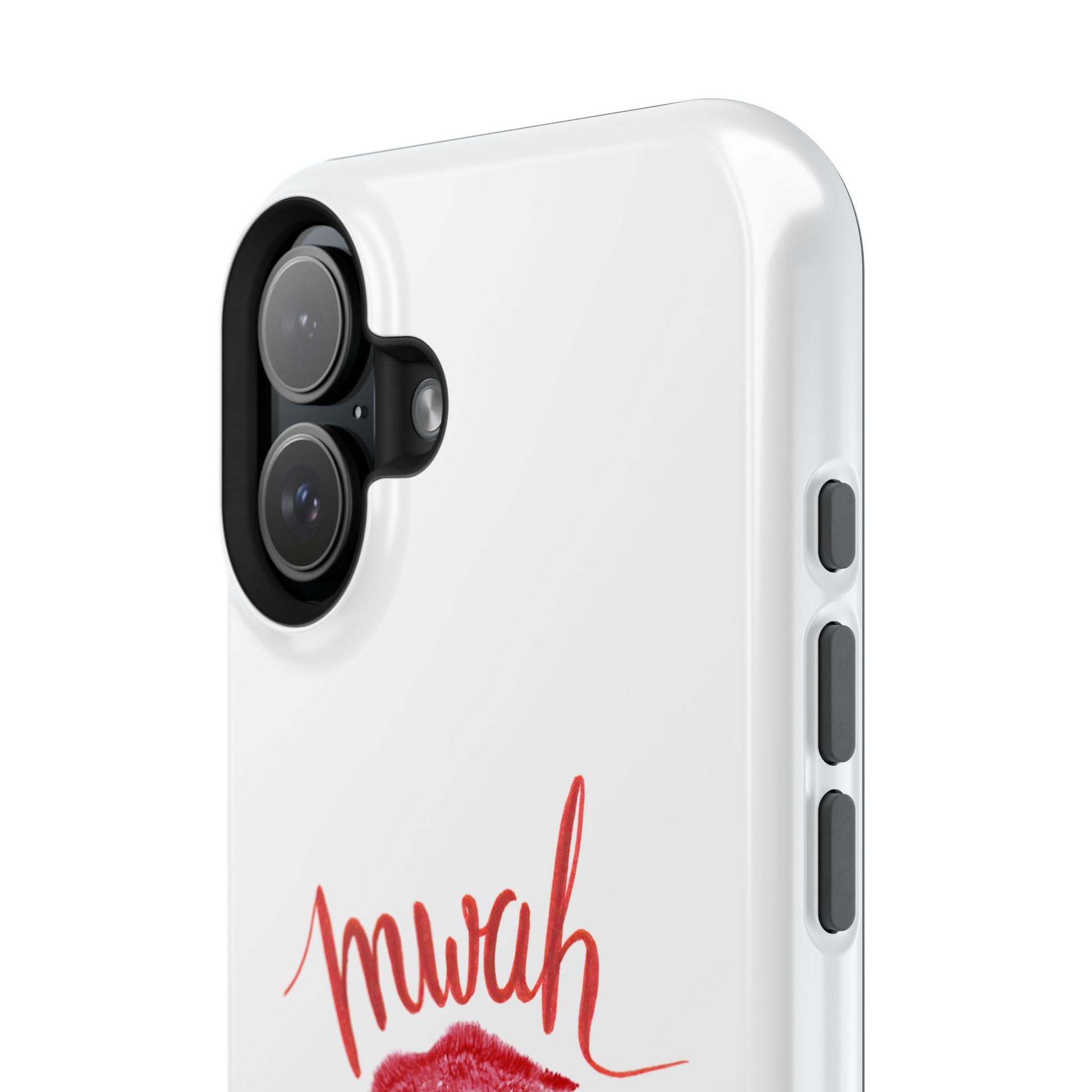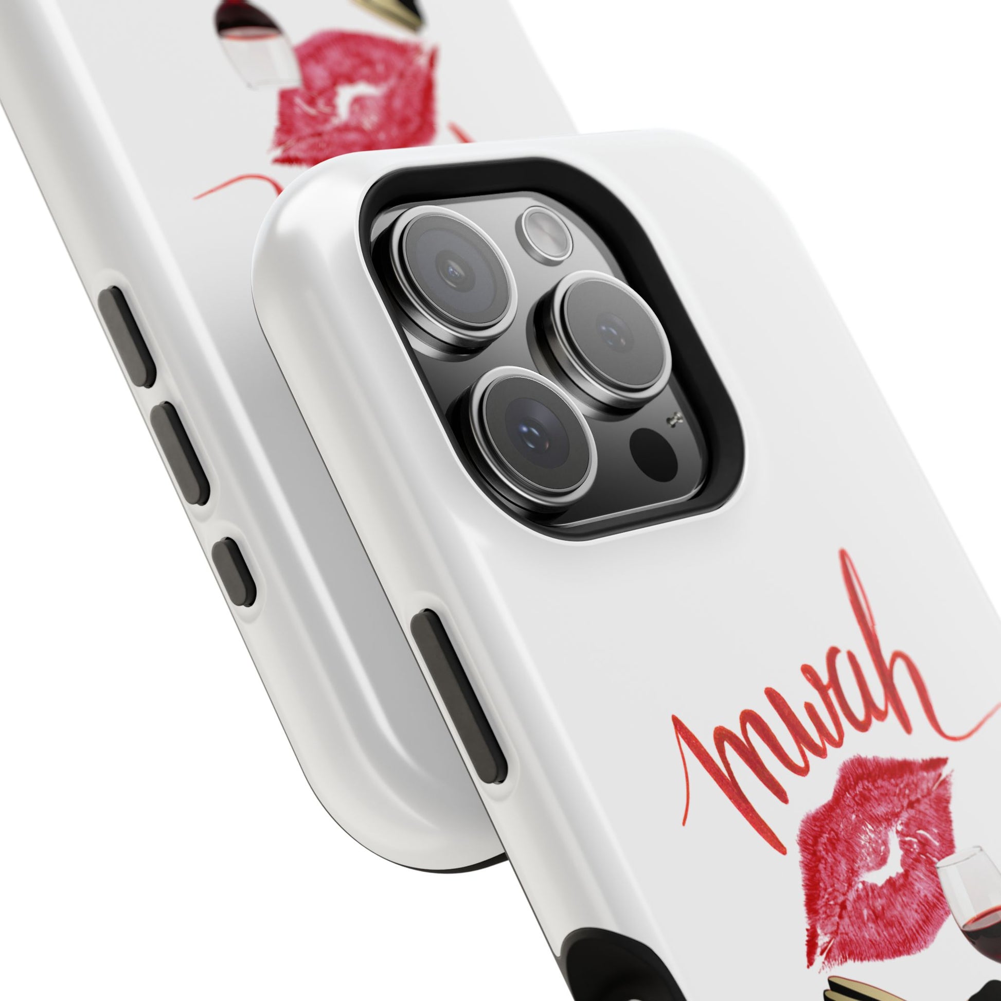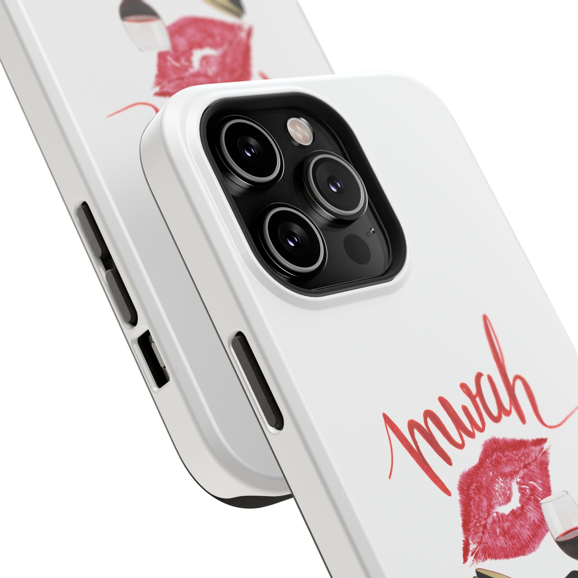 A bold, playful art for your everyday case protection. The soft white background showcases a lipstick kiss, a stiletto, and a glass of red wine beneath a hand-lettered "mwah" — a little wink of glamour for anyone who moves through life with style and a sense of fun. Choose from a glossy or matte finish, so it looks as polished as the person carrying it. It slips easily into a bag, supports wireless charging, and keeps your device safe from scratches and minor bumps while broadcasting a cheeky, confident vibe.I